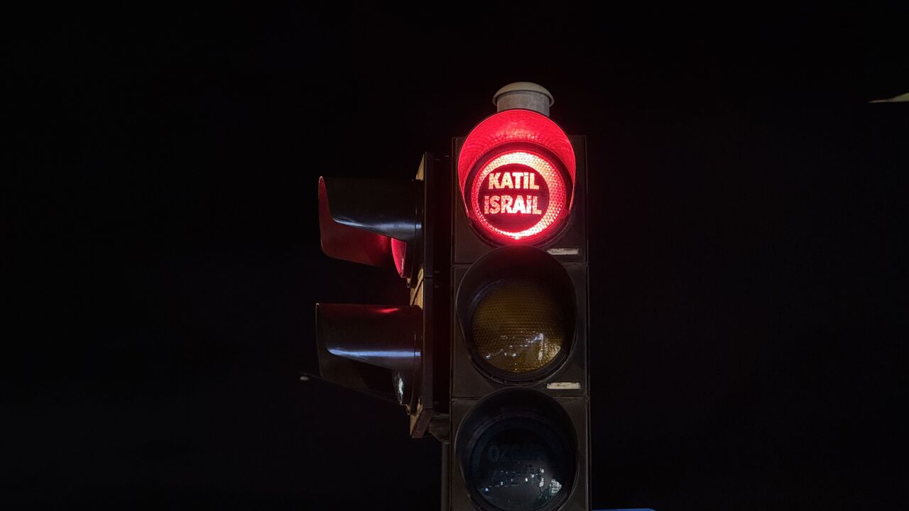 Kırmızı ışık yandığında ise "Katil İsrail" yazısıyla İsrail'in Filistin'e yönelik saldırıları protesto ediliyor.