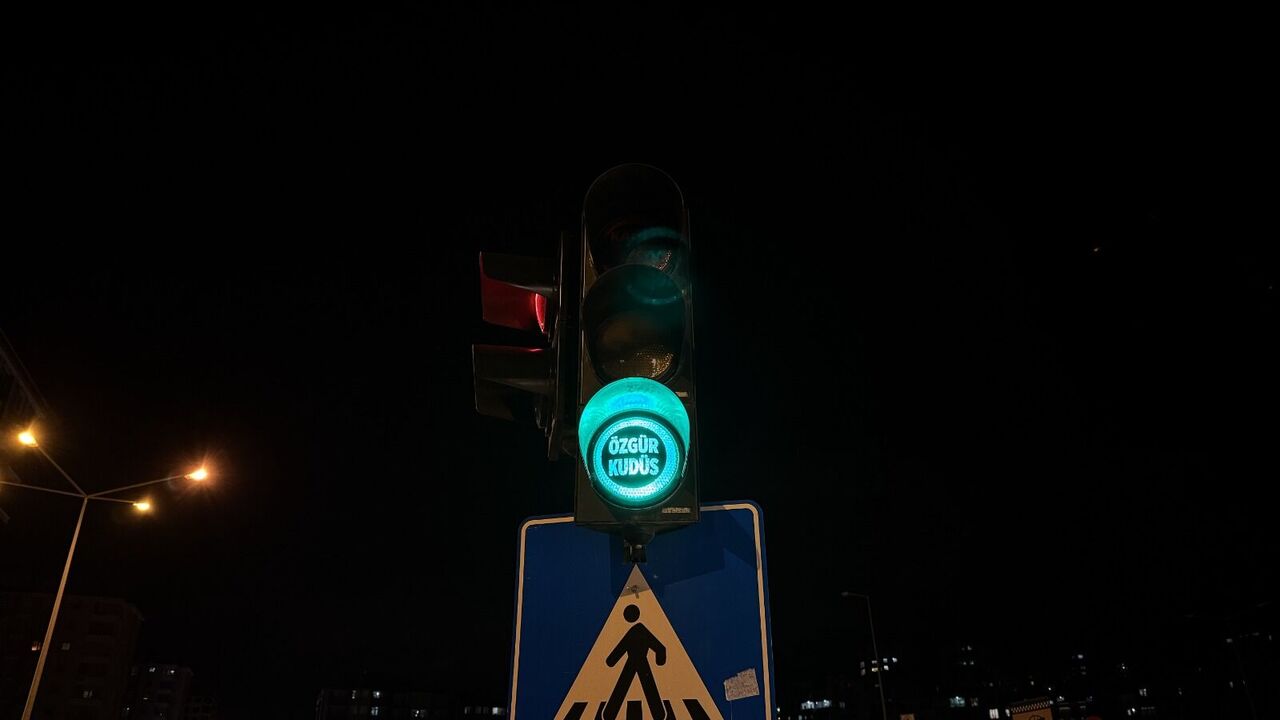Eski Fırın Kavşağı'nda bulunan trafik sinyalizasyon sistemlerindeki yeşil ışık yandığında "Özgür Kudüs" yazısı ortaya çıkıyor.