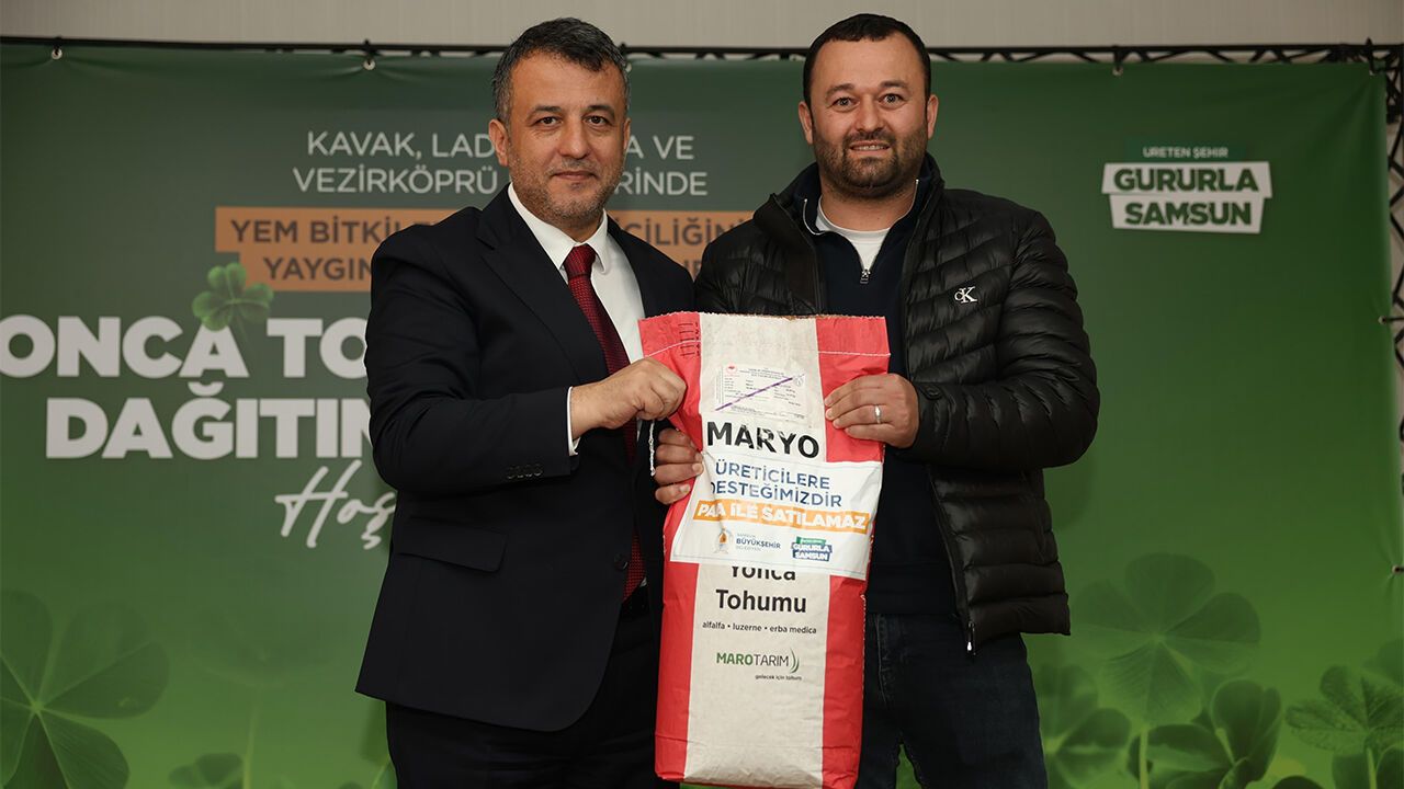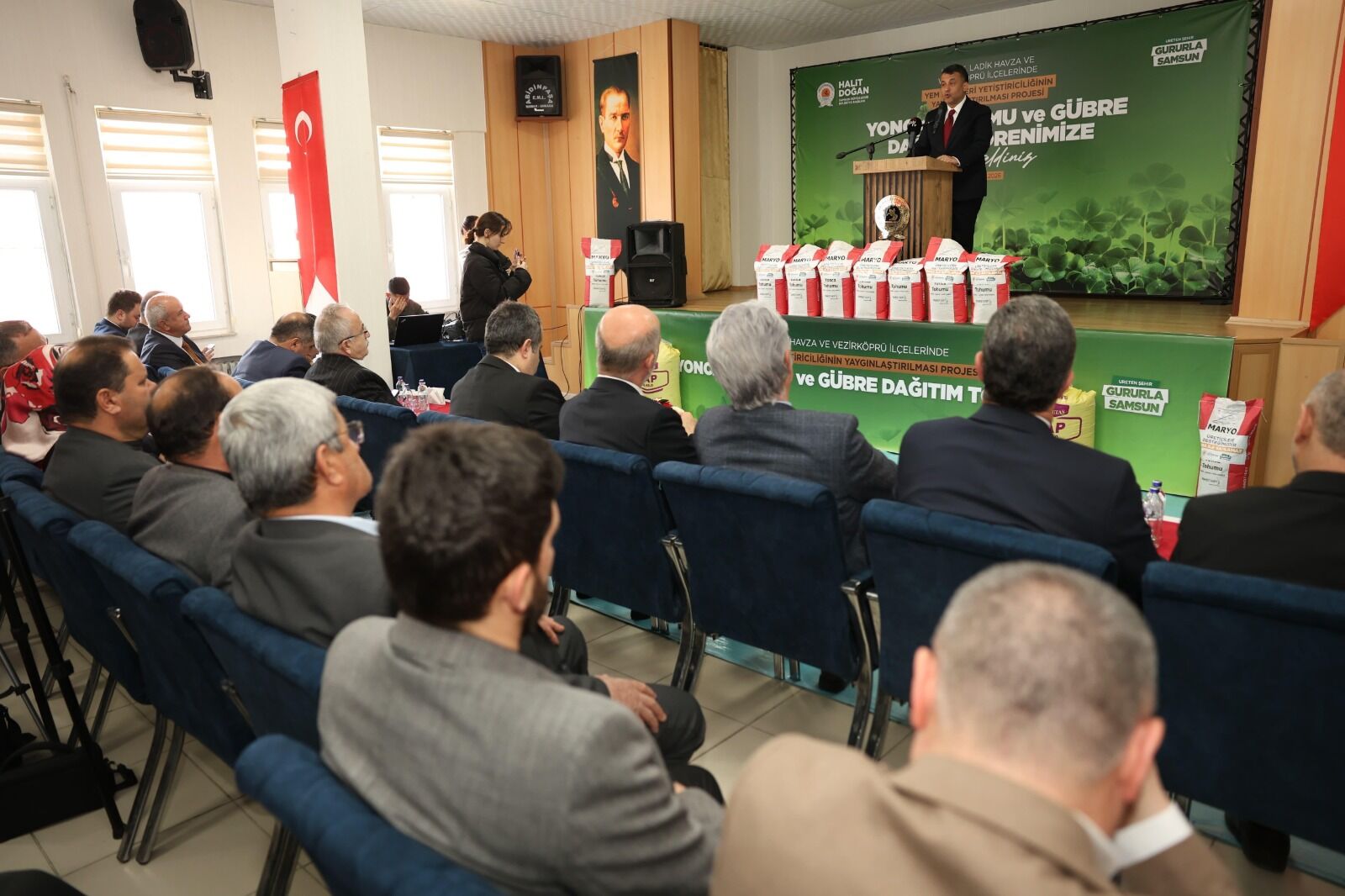 Programda konuşan Başkan Halit Doğan, “Samsun; doğasıyla, kültürüyle ve üretim gücüyle eşsiz bir mozaik şehirdir. Bu mozaiği asıl anlamlı kılan ise Lâdik’ten Vezirköprü’ye, Havza’dan Asarcık’a kadar bu toprakları nasırlı elleriyle işleyen üreticilerimizin emeğidir. Yem Bitkileri Yetiştiriciliğinin Yaygınlaştırılması Projesi kapsamında Yonca Tohumu ve Gübre Dağıtım Töreni’ni gerçekleştirdik. Bugün, bir yıl önce Vezirköprü’de verdiğimiz o sözün arkasında durmanın haklı gururunu yaşıyoruz. Üreticimiz yeter ki üretsin. Biz her zaman, her koşulda onların yanında olmaya, yükünü paylaşmaya devam edeceğiz. Bu vesileyle, projemizde emeği geçen tüm çalışma arkadaşlarıma teşekkür ediyor; üreticilerimizin tohumlarının bereketli, hasadının bol, kazancının daim olmasını diliyorum” ifadelerini kullandı.