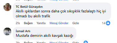 Betül Günaydın ise akıllı trafik ışıklarının trafik yoğunluğunu artırdığına dikkat çekerek, "Akıllı ışıklardan sonra daha çok sıkışıklık fazlalaştı, hiç iyi olmadı bu akıllı trafik" dedi. Günaydın, yapılan düzenlemelerin amacına ulaşamadığını ve trafiği daha karmaşık hale getirdiğini ifade etti.