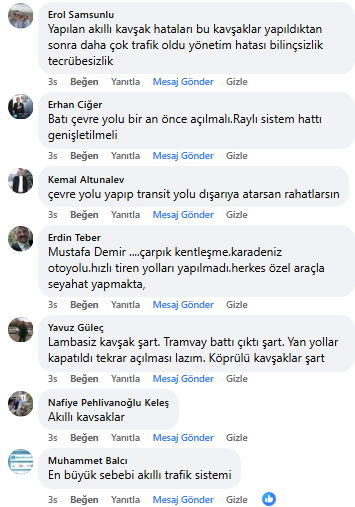 Bazı vatandaşlar ise Batı Çevre Yolu'nun bir an önce açılması ve raylı sistem hattının genişletilmesi gerektiğini belirtti. Erhan Ciğer, "Batı çevre yolu bir an önce açılmalı. Raylı sistem hattı genişletilmeli," dedi.