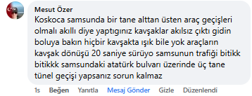 Mesut Özer ise Samsun'da yapılan kavşak düzenlemelerini eleştirerek, "Akıllı diye yaptığınız kavşaklar akılsız çıktı," dedi ve Bolu'daki kavşakları örnek gösterdi. Özer, Atatürk Bulvarı üzerindeki üç tünel geçişi yapılırsa trafik sorununun çözüleceğini savundu.