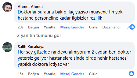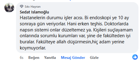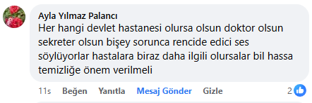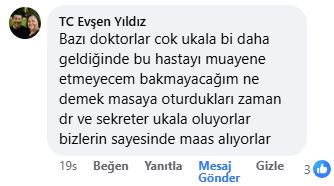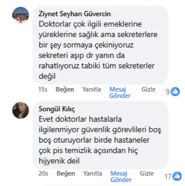 Ziynet Seyhan Güvercin ise doktorların çok ilgili olduğunu, ancak sekreterlere bir şey sormanın zor olduğunu belirtti. Güvercin, sekreterlerin tavırlarının olumsuz olduğunu, bunun ise hastaların doktorlarla rahat iletişim kurmasına engel olduğunu söyledi. Ancak, bu durumun tüm sekreterler için geçerli olmadığını da ekledi.