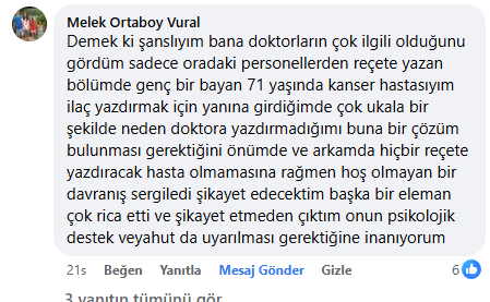 Melek Ortaboy Vural, genel olarak doktorların ilgisini olumlu bulduğunu ancak bir reçete yazan personelin tutumundan rahatsız olduğunu belirtti. Vural, 71 yaşındaki kanser hastası olduğunu ve ilaç yazdırmak için gittiği bölümde, çok ukala bir şekilde karşılaştığını ifade etti.