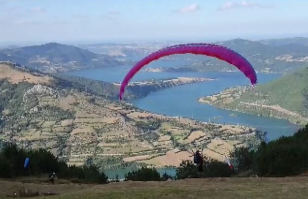 5. Uluslararası Kapıkaya Doğa Sporları Festivali'nde yamaç paraşütü atlayışı yapan kişi havalandıktan hemen sonra güvenlik ipinden sıyrıldı.
