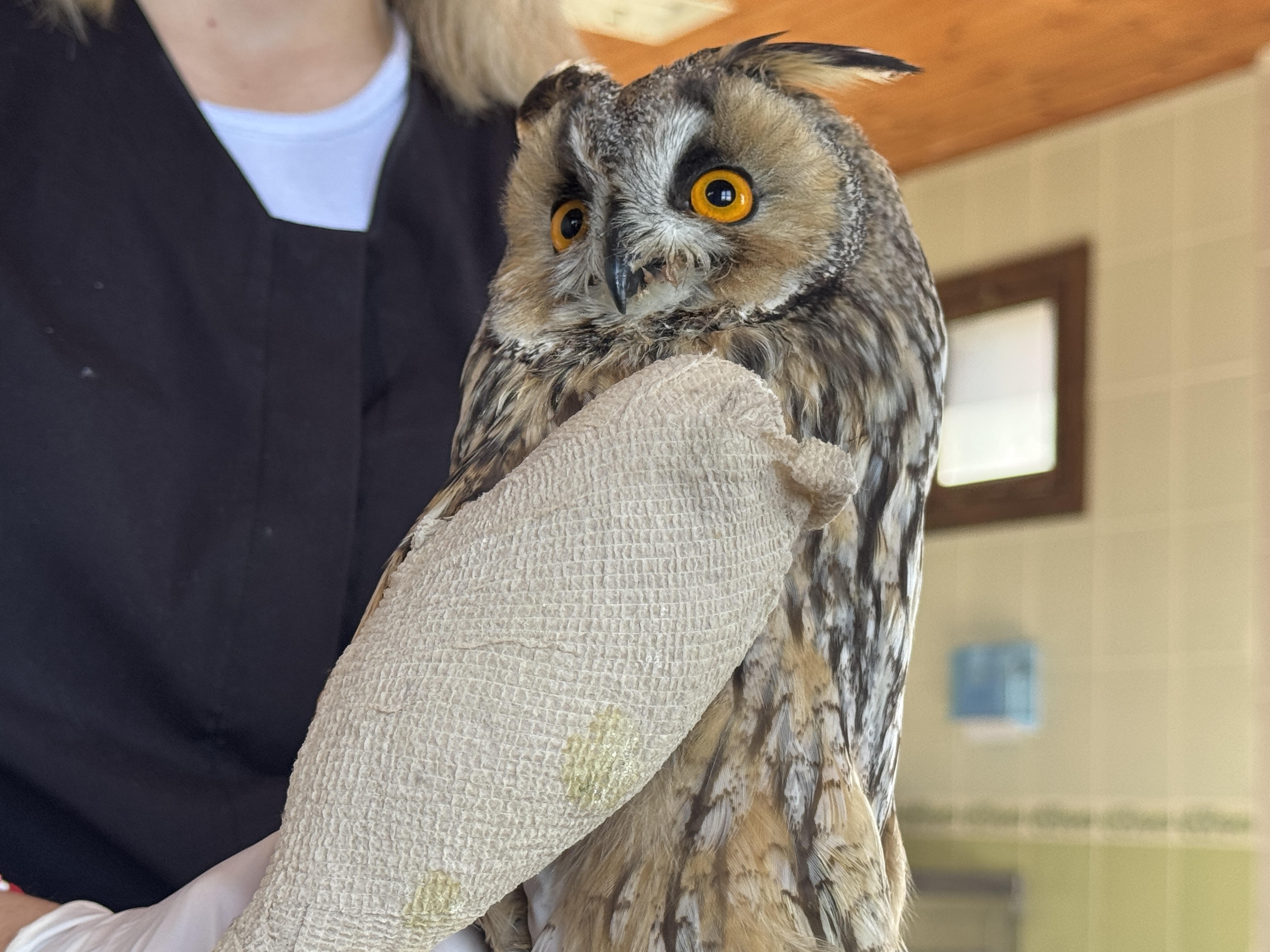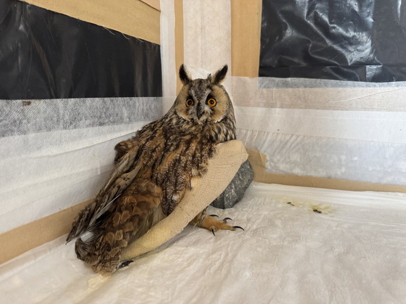 Yapılan kontrolde puhu kuşunun kanadında kırık tespit edildi. Klinikte görevli Veteriner Hekim Paria İsfendiyaroğlu tarafından kanadı bandaja alınan puhu, yemekte zorluk çektiği için her gün elle besleniyor.