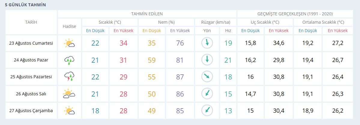 23 Ağustos Cumartesi: Az bulutlu, en düşük 22, en yüksek 34 derece