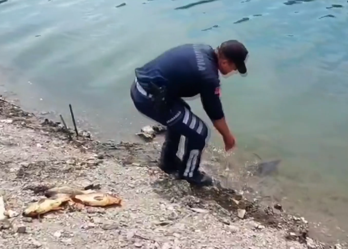 Olta ve kafesi sudan çıkaran ekipler, içindeki 50 kilogram sazanı da göle bıraktı.