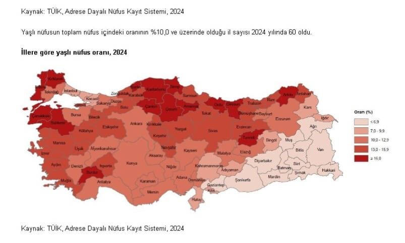 Öte yandan yaşlı nüfus oranının en yüksek olduğu il 2024 yılında yüzde 20,8 ile Sinop olurken, yaşlı nüfus oranının en düşük olduğu il ise yüzde 3,7 ile Şırnak oldu.