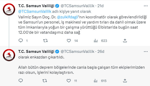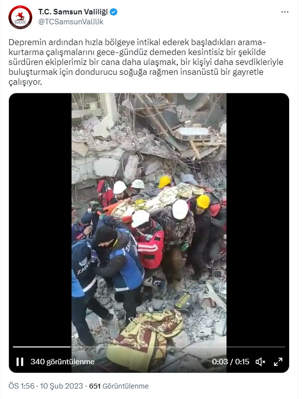 Valimiz Sayın Doç. Dr. Zülkif Dağlı’nın koordinatör olarak görevlendirildiği ve Samsun’un personel, iş makinesi ve yardım tırları da dahil olmak üzere tüm imkanlarıyla yoğun bir çalışma yürüttüğü Elbistan'da bugün saat 12.00'de bir vatandaşımız daha sağ Samsun Valiliği.