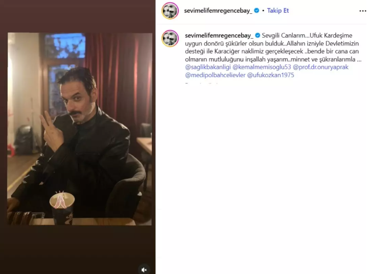 “Sevgili canlarım… Ufuk kardeşime uygun donörü şükürler olsun bulduk. Allah’ın izniyle devletimizin ve Sayın Bakanımız Kemal Memişoğlu’nun desteğiyle karaciğer naklimiz gerçekleşecek. Bir cana can olmanın mutluluğunu inşallah yaşarım.”