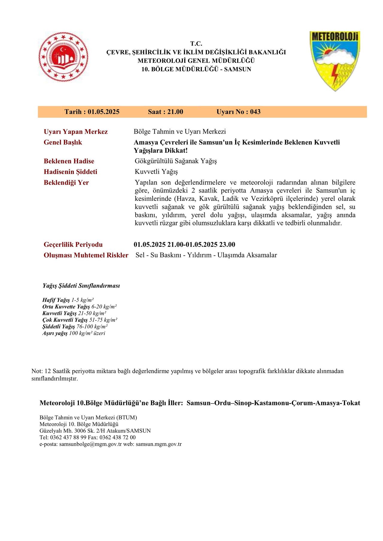 Meteoroloji Genel Müdürlüğü, Samsun'un iç kesimleri ile Amasya çevreleri için kuvvetli sağanak yağış uyarısında bulundu. Yapılan son değerlendirmelere ve meteoroloji radarından alınan verilere göre, önümüzdeki 2 saatlik süreçte Havza, Kavak, Ladik ve Vezirköprü ilçelerinde yerel olarak kuvvetli sağanak ve gök gürültülü sağanak yağış bekleniyor.