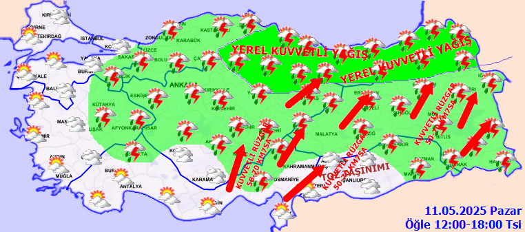 Meteoroloji'nin 11 Mayıs raporuna göre ülkenin birçok noktasında sağanak ve gök gürültülü sağanak bekleniyor. Yapılan açıklamada, "Yağışların, Orta ve Doğu Karadeniz ile Erzurum'un kuzeyi, Kars ve Ardahan çevrelerinde yerel kuvvetli olması beklendiğinden yaşanabilecek olumsuzluklara karşı dikkatli ve tedbirli olunmalıdır." ifadelerine yer verildi.