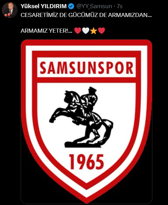 Samsunspor Başkanı Yüksel Yıldırım, mesajında “Cesaretimiz de gücümüz de armamızdan… Armamız yeter!” ifadelerine yer verdi.