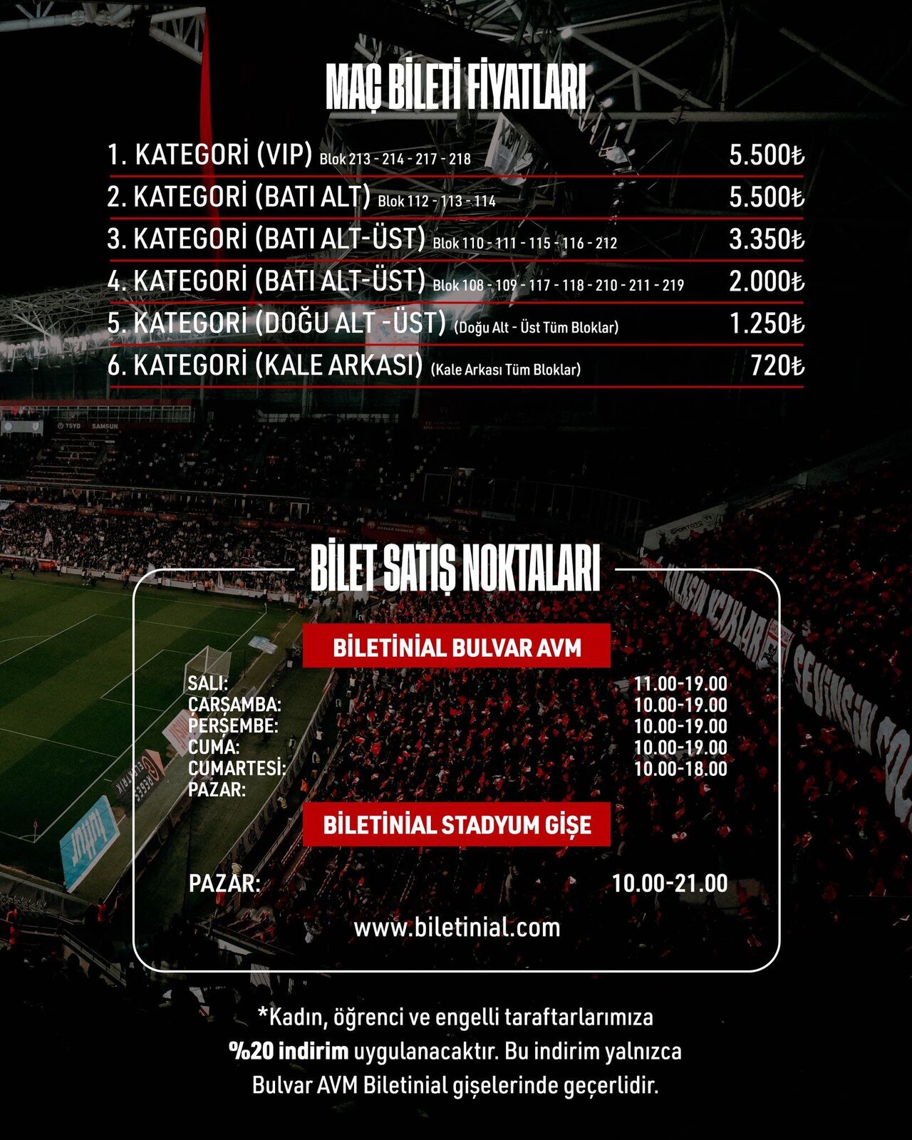 Kadın, öğrenci ve engelli taraftarlara yüzde 20 indirim uygulanacak. Bu indirim yalnızca Bulvar AVM Biletinial gişelerinde geçerli olacak.