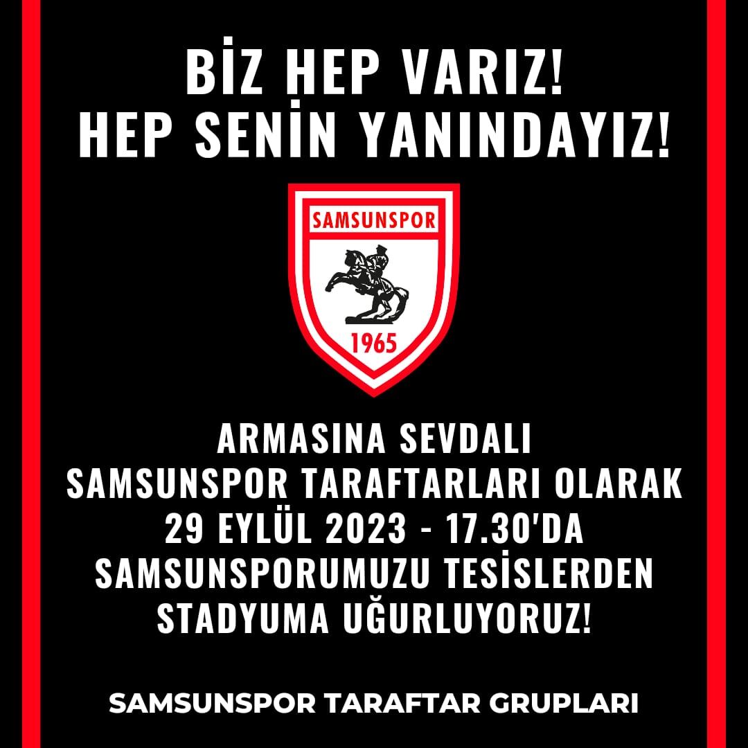 Samsunspor Taraftar Grupları tarafından yapılan açıklamada ise şu ifadelere yer verildi: "Armasına sevdalı Samsunspor taraftarları olarak, 29 Eylül Cuma günü 17.30'da takımımızı, Samsunspor tesislerimizden stadyuma uğurluyoruz"
