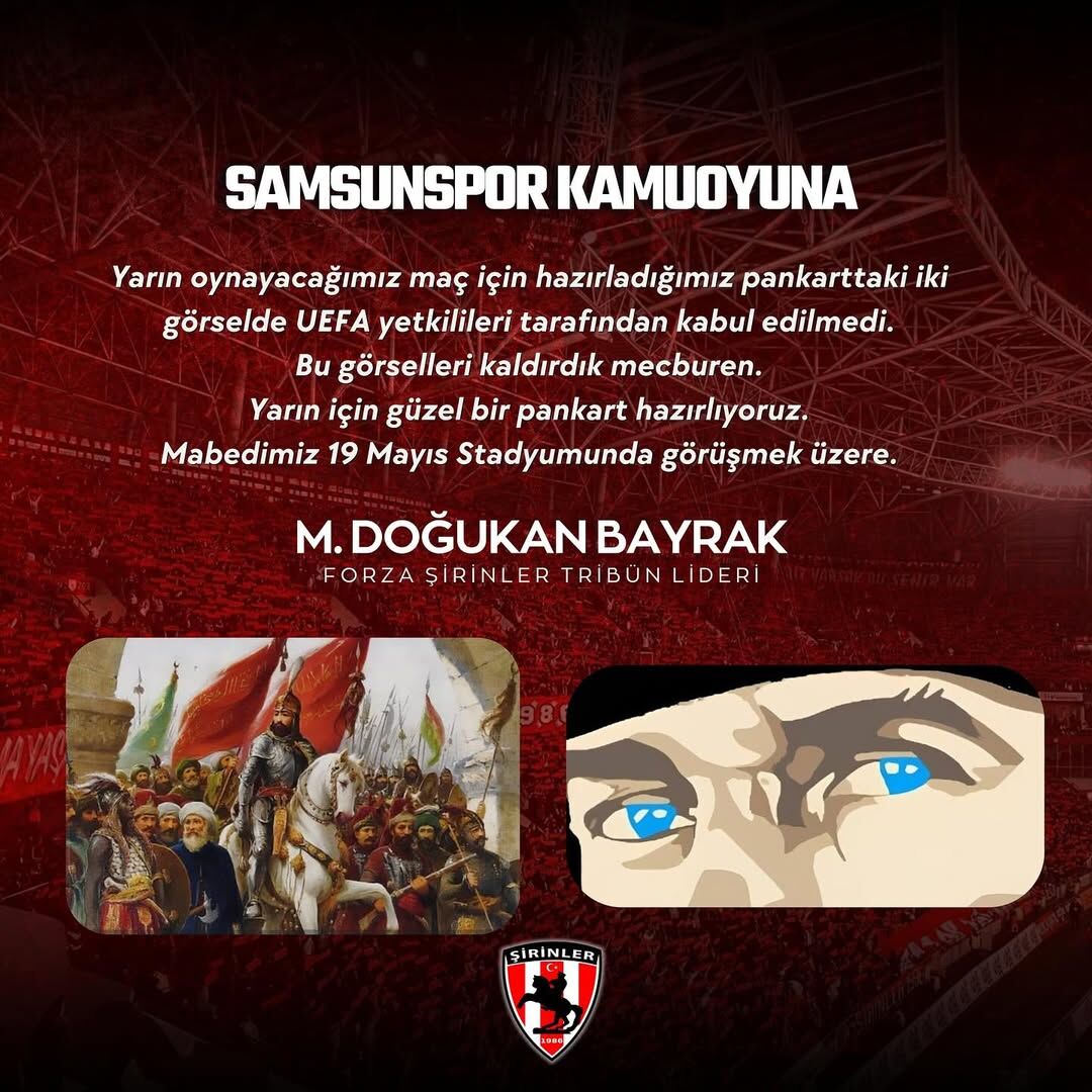 Paylaşımda, “Yarın oynayacağımız maç için hazırladığımız pankarttaki iki görsel UEFA yetkilileri tarafından kabul edilmedi. Bu görselleri kaldırdık mecburen” ifadelerine yer verildi.