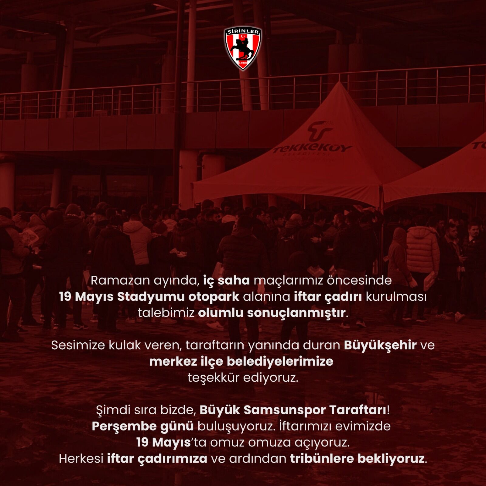 Açıklamada, “Şimdi sıra bizde, Büyük Samsunspor Taraftarı! Perşembe günü buluşuyoruz. İftarımızı evimizde 19 Mayıs’ta omuz omuza açıyoruz. Herkesi iftar çadırımıza ve ardından tribünlere bekliyoruz” ifadelerine yer verildi.