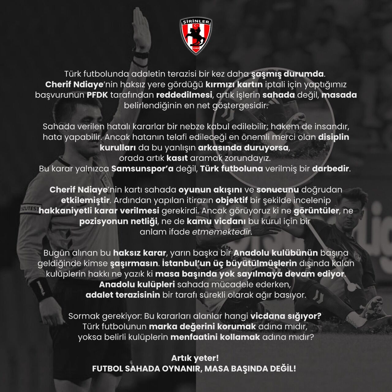 Taraftarlar ayrıca, Ndiaye’nin haksız yere kırmızı kart gördüğünü belirterek itirazın reddedilmesinin futbolun adaletini zedelediğini savunarak, “Alınan bu haksız karar, yarın başka bir Anadolu kulübünün başına geldiğinde kimse şaşırmasın. İstanbul’un üç büyükleri dışında kalan kulüplerin hakkı masa başında yok sayılmaya devam ediyor. Anadolu kulüpleri sahada mücadele ederken, adalet terazisinin bir tarafı sürekli olarak ağır basıyor. Artık yeter! Futbol sahada oynanır, masa başında değil!” denildi. Haber Merkezi