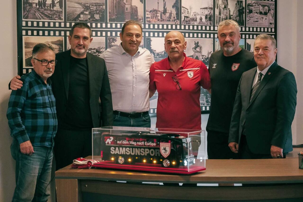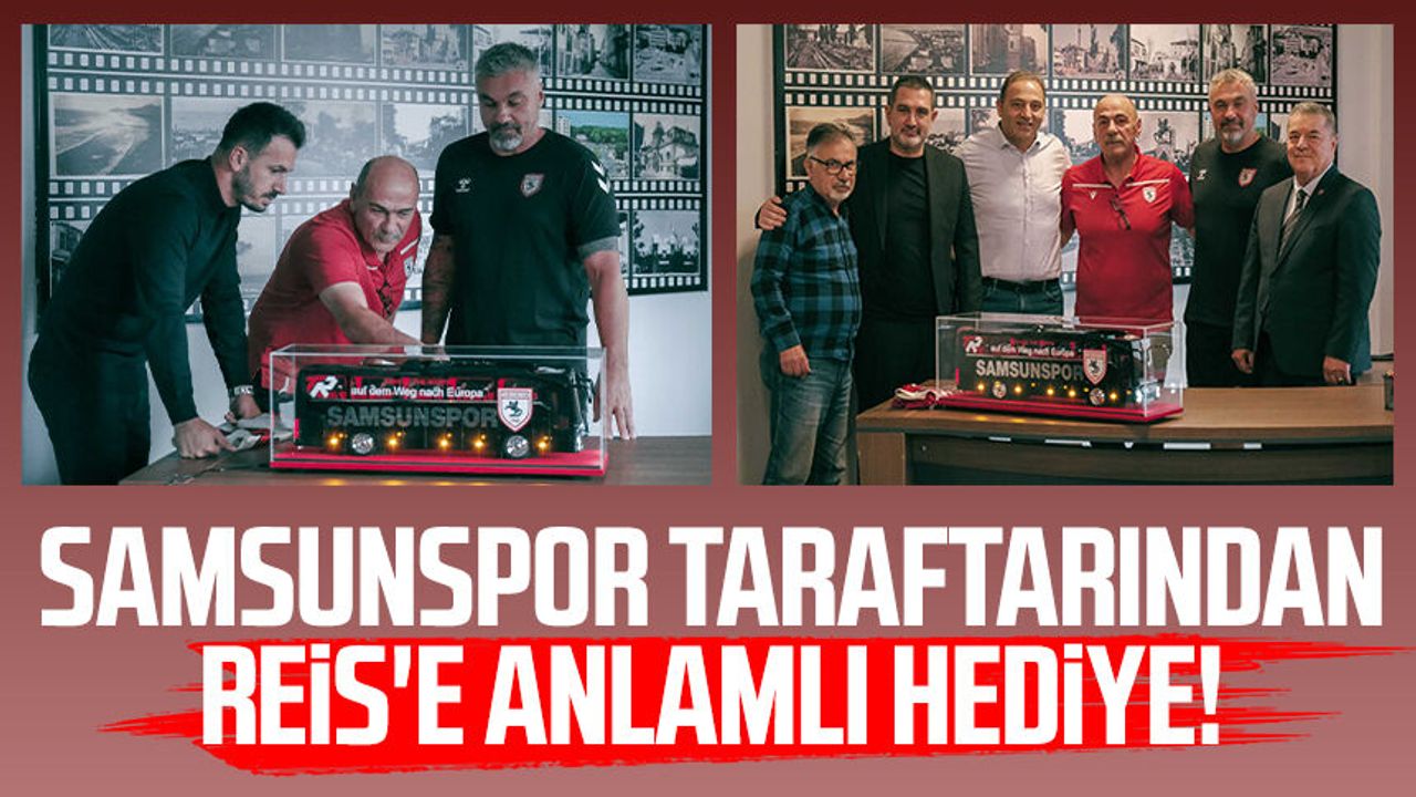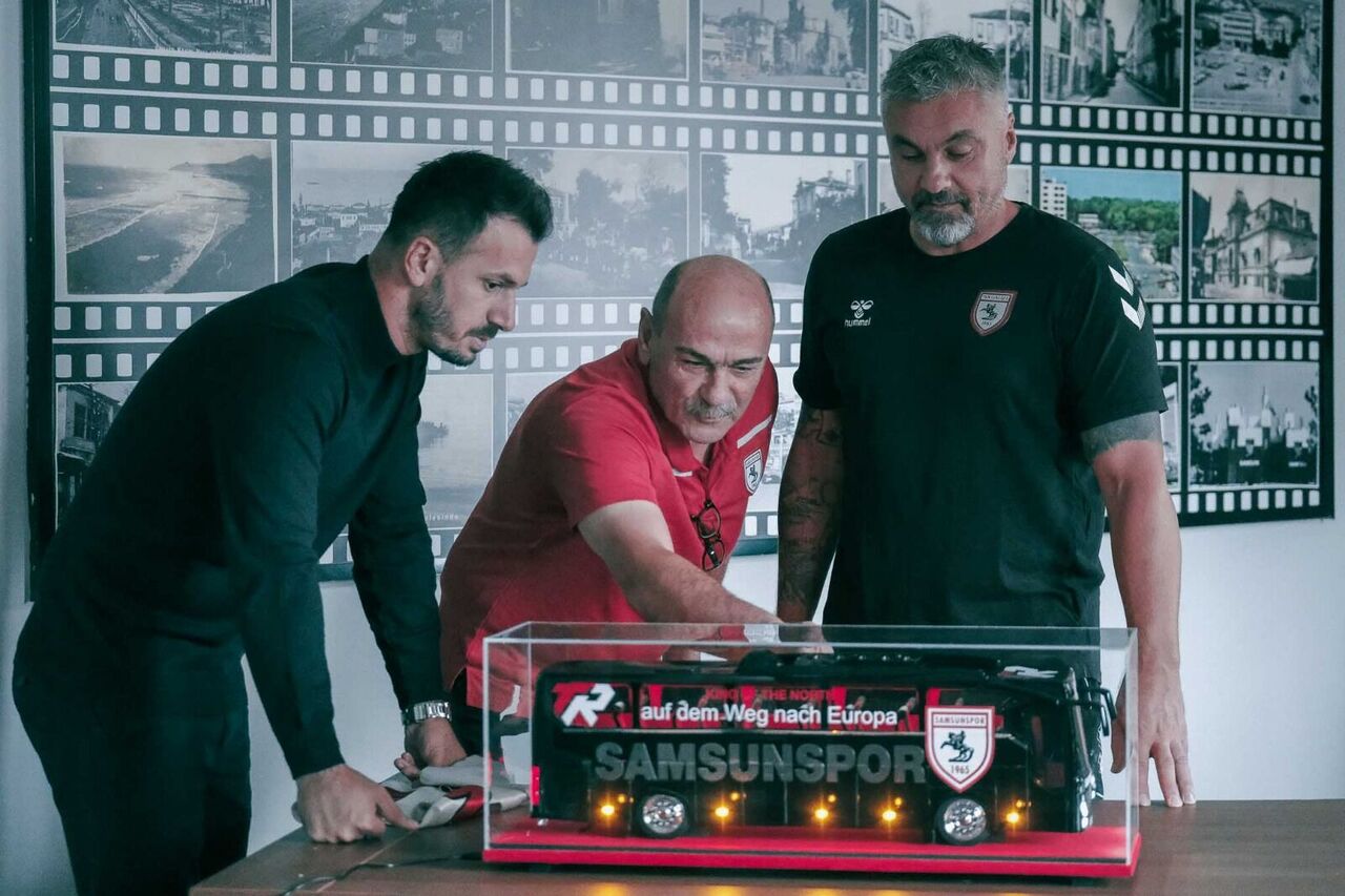 Samsunspor taraftarı Adnan Ballı, Nuri Asan Tesisleri’nde Teknik Direktör Reis ile bir araya gelerek maket otobüsü teslim etti.