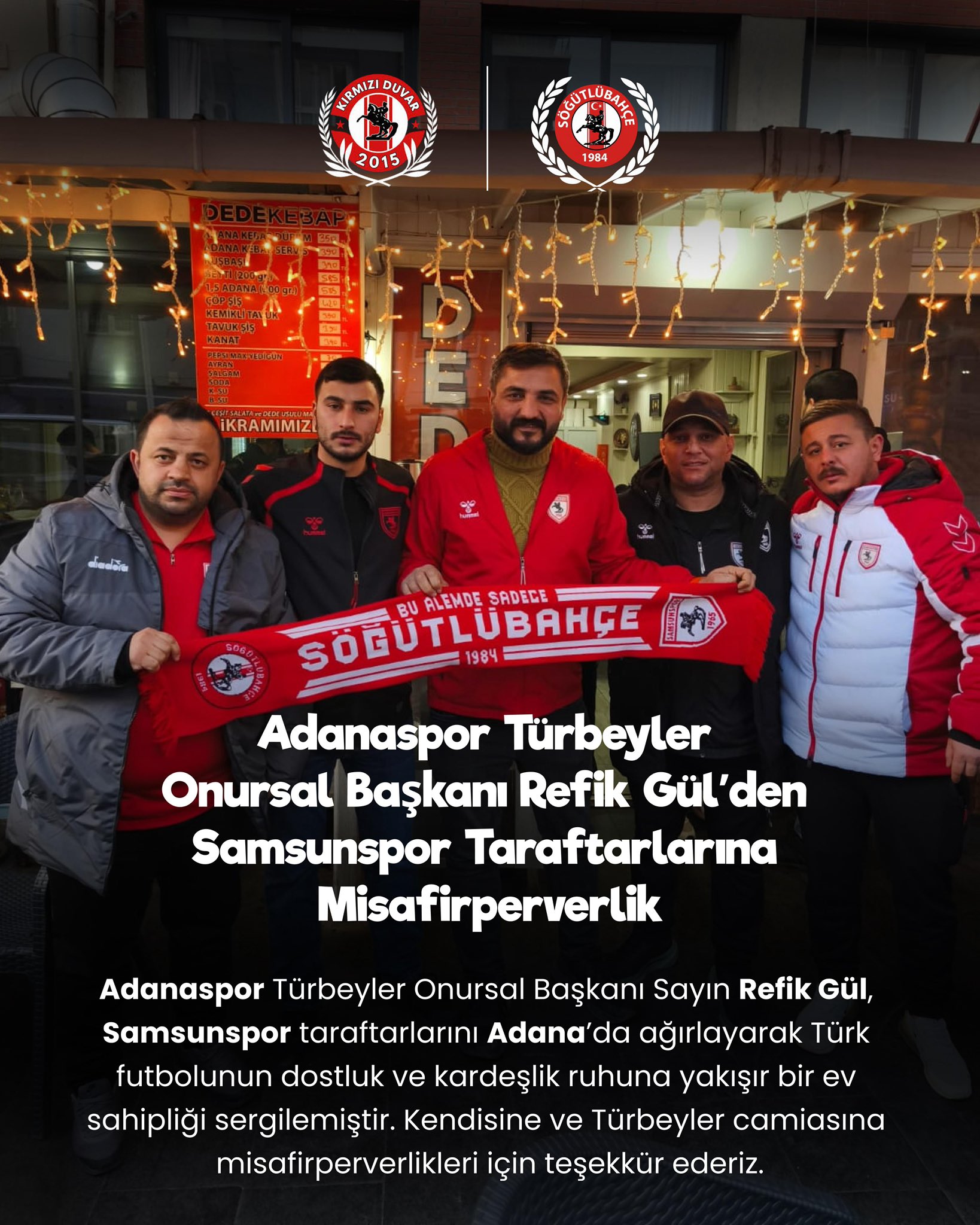 Söğütlübahçe Samsunspor Taraftarlar Derneği açıklamasında, “Adanaspor Türbeyler Onursal Başkanı Sayın Refik Gül, Samsunspor taraftarlarını Adana’da misafir ederek örnek bir ev sahipliği sergilemiştir. Kendisine ve Türbeyler camiasına misafirperverlikleri için teşekkür ederiz” ifadelerine yer verildi.