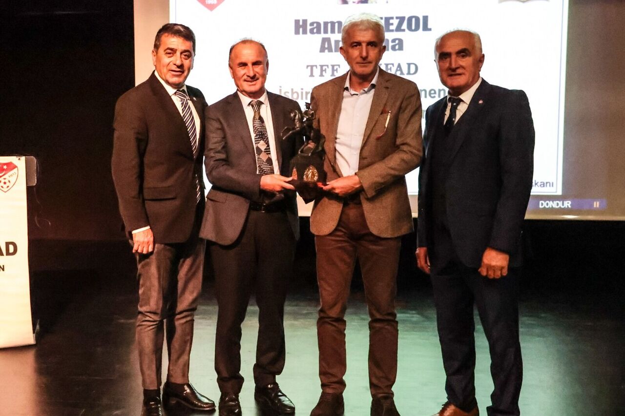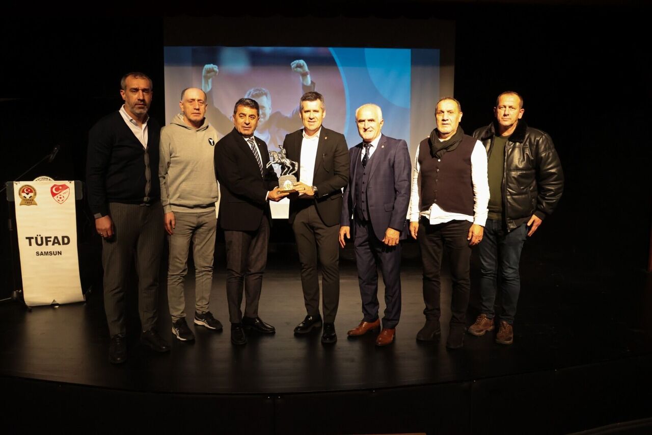 Seminer sonrası TÜFAD Samsun Şubesi Başkanı Hakkı Bayrak ve yönetim kurulu üyeleri ikiliye Onur Anıtı heykeli taktim etti.