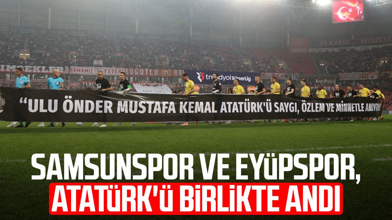 Samsunspor ve Eyüpsporlu futbolcular, seremoniye “Ulu Önder Mustafa Kemal Atatürk’ü saygı, özlem ve minnetle anıyoruz” yazılı pankartla birlikte çıktı.