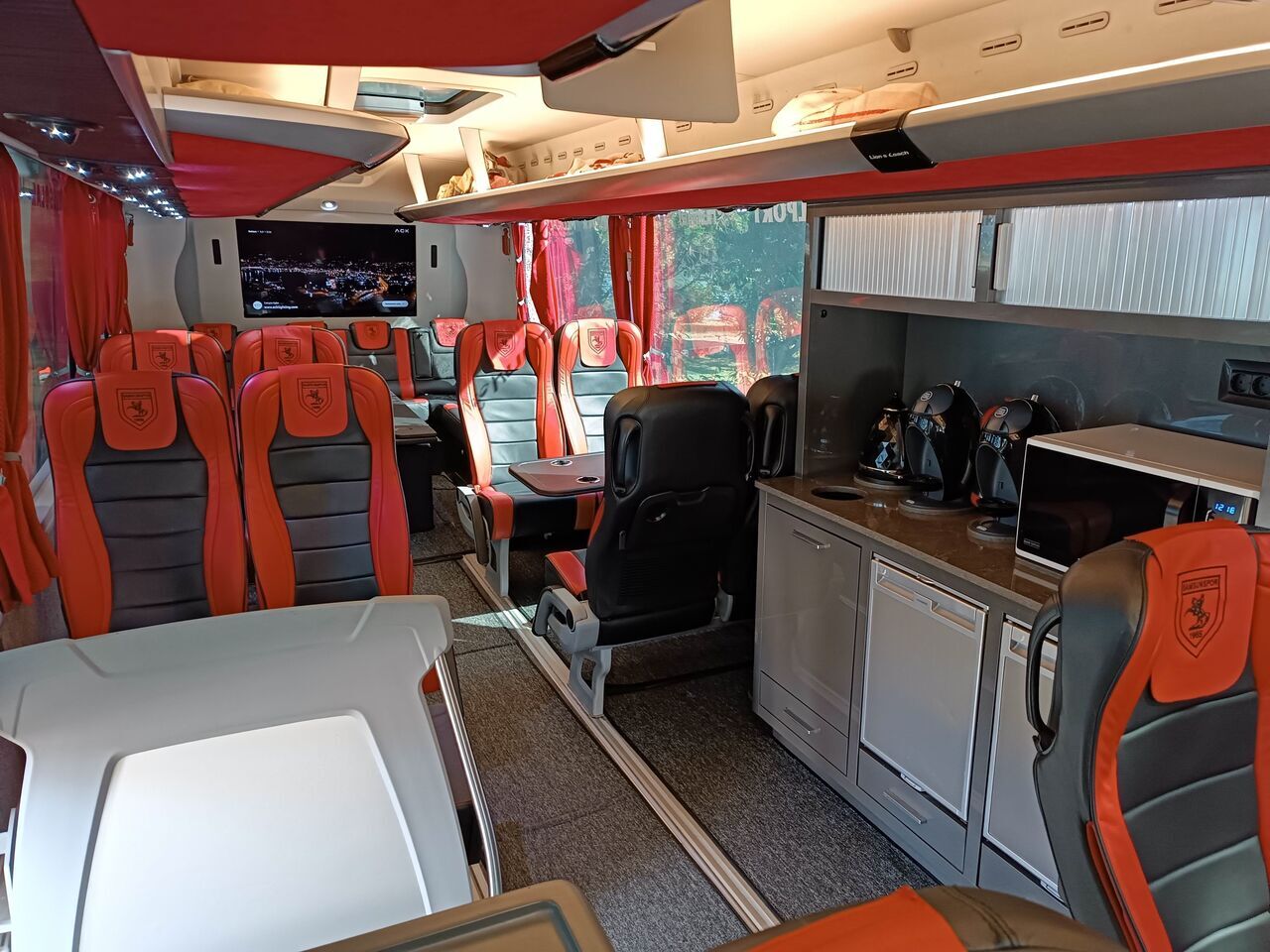 Çok az sayıda takımda bu kadar geniş imkanlı takım otobüsünün olduğunu ifade eden şoför Recep Terzi, “Otobüs; diğer takım otobüslerine göre oldukça geniş. Ayağını rahatça uzatabiliyorsun. Servis masaları aynı zamanda ayak dinlendirme yeri haline gelebiliyor. Koltuk araları diğer otobüslere göre oldukça fazla. Televizyonlar da koltuk arkalarında değil belirli aralıklarla otobüsün ortasında bulunuyor. Televizyonlarda internet ve uydu var. Otobüsün için buzdolapları, kahve makineleri, mikrodalga fırın, tuvalet, 4 kişilik yatak da var. Ayrıca otobüsün en arkasında bulunan masa açılıyor. Üstüne ekipmanları serdiğimizde 4 kişilik geniş bir yatağa dönüşüyor. Bu kadar donanımlı, son teknoloji ve geniş bir otobüs Türkiye’de başka bir takımda yok. Başkanımız Yüksel Yıldırım, futbolcuların rahatça seyahat etmesi için bu otobüsü dizayn ettirmiş” dedi.