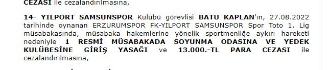 PFDK toplantısı sonrası alınan kararda, "Yılport Samsunspor Kulübü görevlisi Batu Kaplan'ın 27.08.2022 tarihinde oynanan Erzurumspor FK-Yılport Samsunspor, Spor Toto 1. Lig müsabakasında, müsabaka hakemlerine yönelik sportmenliğe aykırı hareketi nedeniyle 1 RESMİ MÜSABAKADA SOYUNMA ODASINA VE YEDEK KULÜBESİNE GİRİŞ YASAĞI ve 13.000.-TL PARA CEZASI ile cezalandırılması" ifadesine yer verildi.