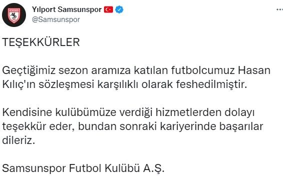 SAMSUNSPOR HASAN KILIÇ İLE YOLLARINI AYIRDI