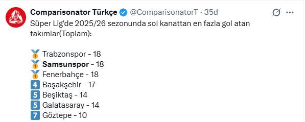 Trendyol Süper Lig 2025/26 sezonu verilerine göre Samsunspor, sol kanattan attığı 18 golle zirvede yer alan takımlar arasına adını yazdırdı. Comparisonator verilerine göre kırmızı-beyazlılar, bu alanda Fenerbahçe ve Trabzonspor ile birlikte ilk sırayı paylaştı.