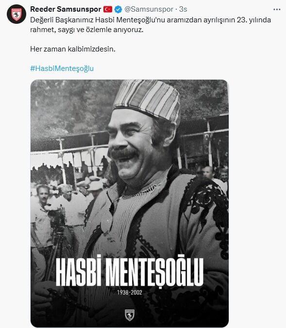 Kırmızı-Beyazlılar, efsane başkan Hasbi Menteşoğlu'nun vefatının 23'üncü yılında mesaj yayımladı. Samsunspor'dan yayımlanan mesajda," Değerli Başkanımız Hasbi Menteşoğlu'nu aramızdan ayrılışının 23. yılında rahmet, saygı ve özlemle anıyoruz. Her zaman kalbimizdesin." ifadelerine yer verildi.