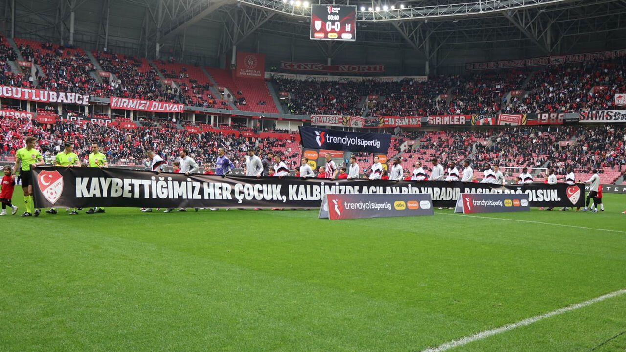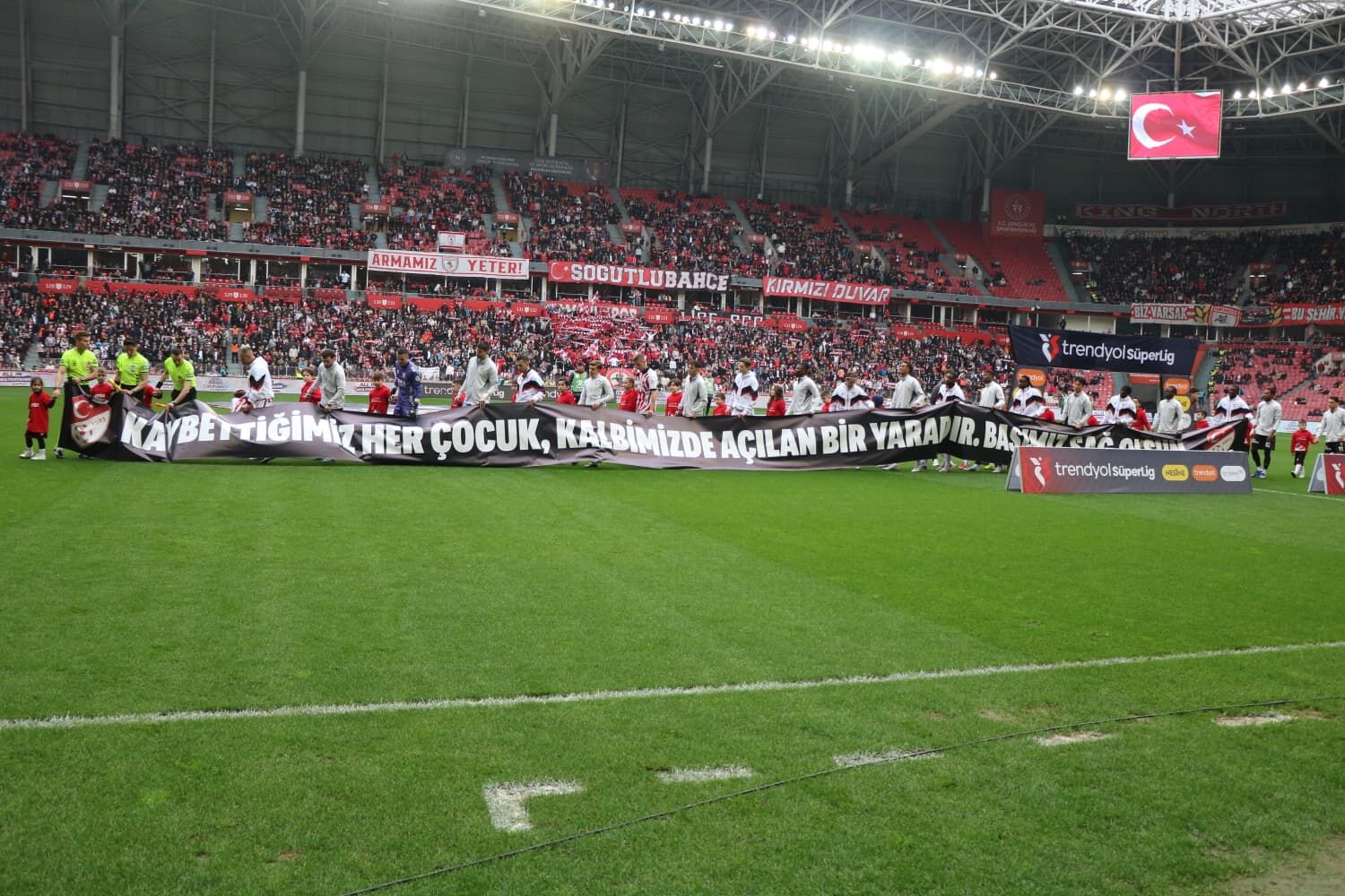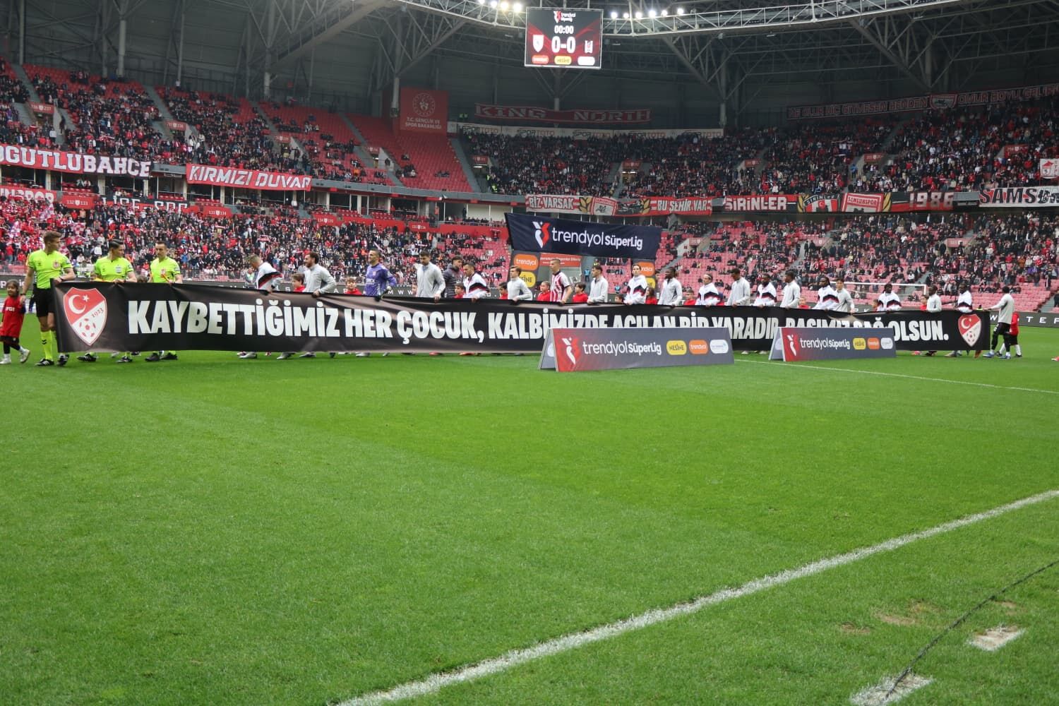 Futbolcuların birlikte taşıdığı pankartta, “Kaybettiğimiz her çocuk, kalbimizde açılan bir yaradır. Başımız sağ olsun” ifadeleri yer aldı.