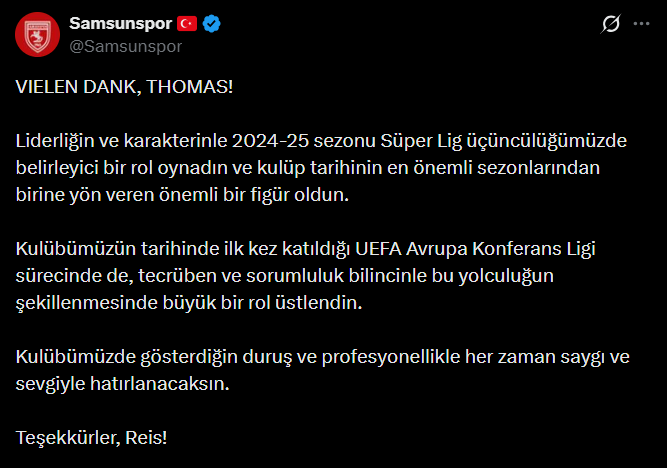 Samsunspor, teknik direktör Thomas Reis ile yolların ayrılmasının ardından sosyal medya hesabından bir teşekkür mesajı yayımladı. Paylaşımda, Reis’in görev süresi boyunca takıma sağladığı katkılara dikkat çekildi.