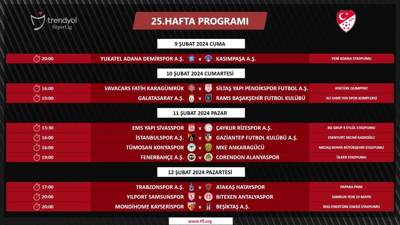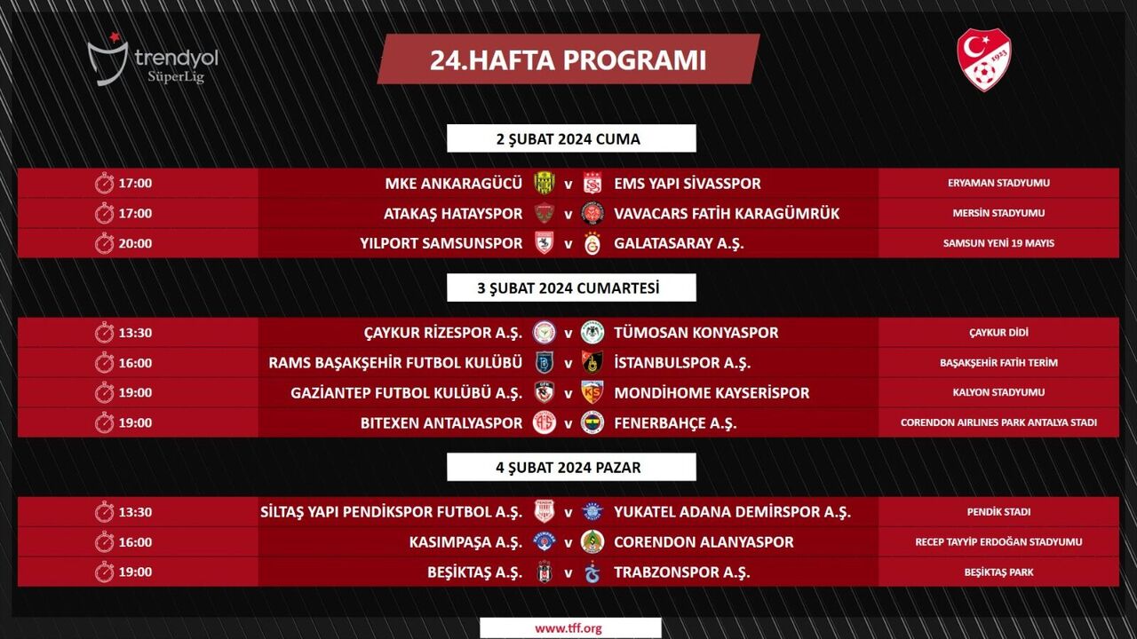 TFF'nin resmi internet sitesinden yapılan açıklamaya göre Süper Lig'de 24 ve 25. haftanın karşılaşma programları şu şekilde: