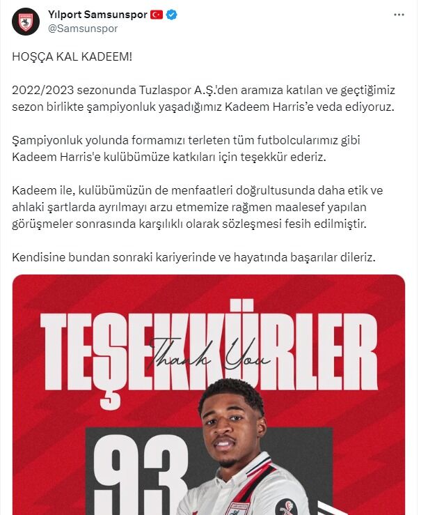 Kırmızı-beyazlılardan yapılan açıklamada, “2022/2023 sezonunda Tuzlaspor A.Ş.'den aramıza katılan ve geçtiğimiz sezon birlikte şampiyonluk yaşadığımız Kadeem Harris’e veda ediyoruz. Şampiyonluk yolunda formamızı terleten tüm futbolcularımız gibi Kadeem Harris'e kulübümüze katkıları için teşekkür ederiz. Kadeem ile, kulübümüzün de menfaatleri doğrultusunda daha etik ve ahlaki şartlarda ayrılmayı arzu etmemize rağmen maalesef yapılan görüşmeler sonrasında karşılıklı olarak sözleşmesi fesih edilmiştir. Kendisine bundan sonraki kariyerinde ve hayatında başarılar dileriz” ifadelerine yer verildi.