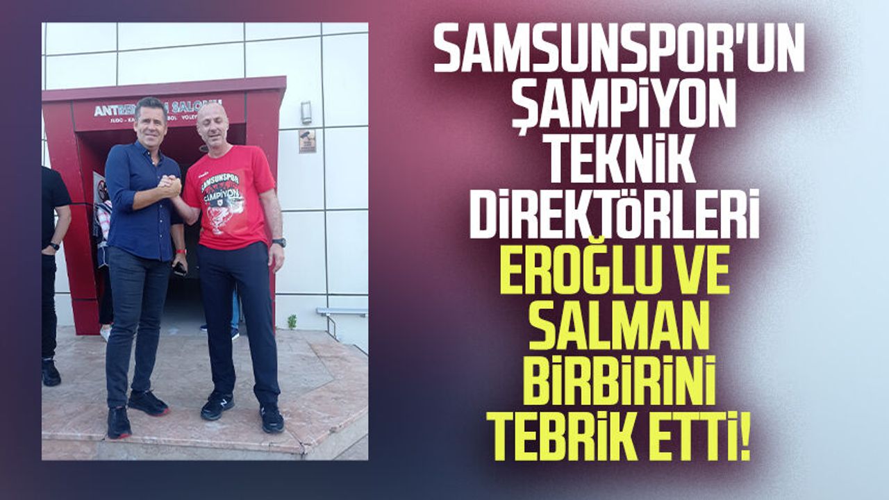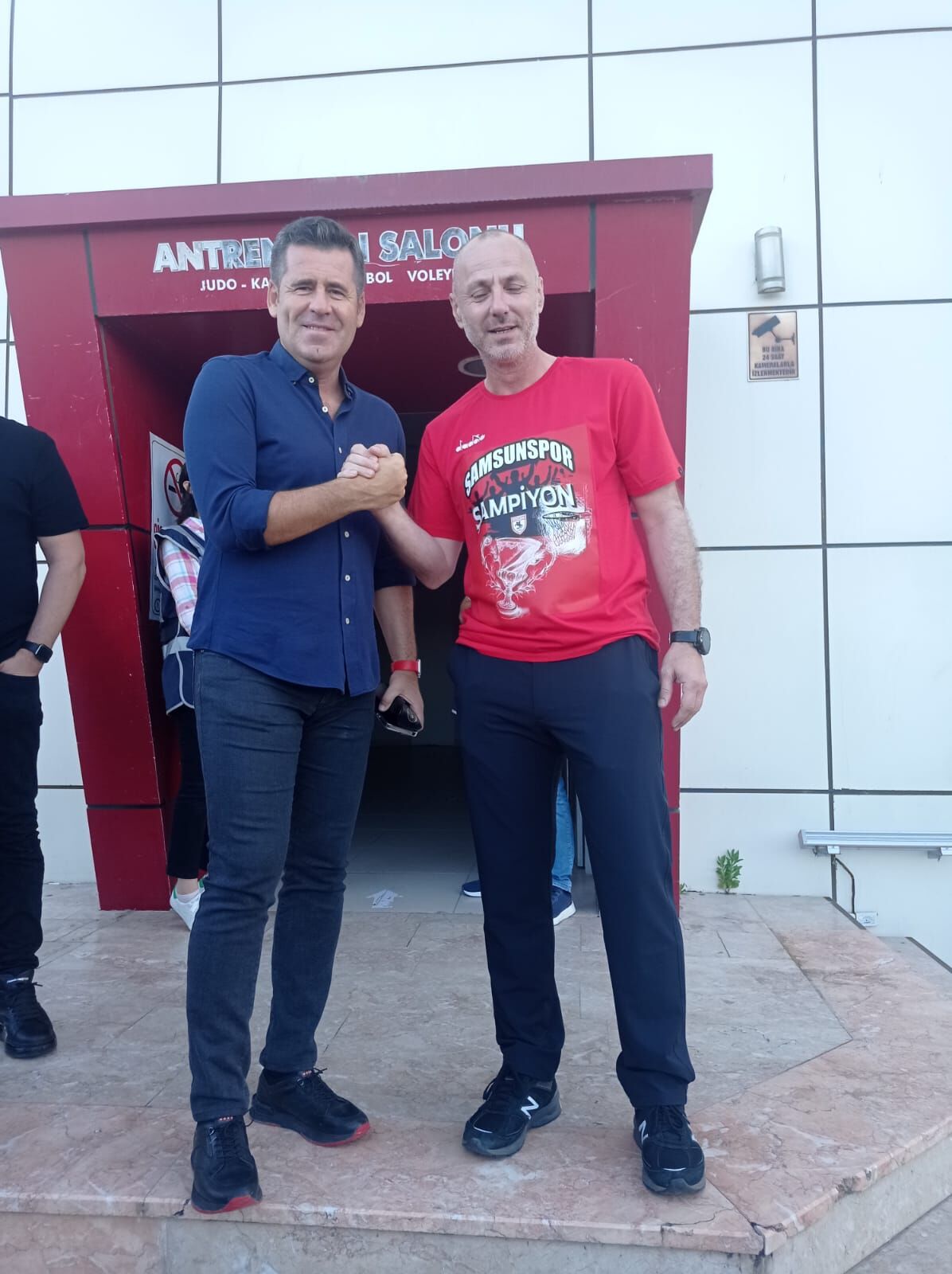 Yılyak Samsunspor Basketbol'un Süper Lig'e yükselmesi dolayısıyla gerçekleşen kupa töreni öncesi 2 şampiyon takımın teknik direktörü Hüseyin Eroğlu ve İlker Salman birbirini tebrik etti