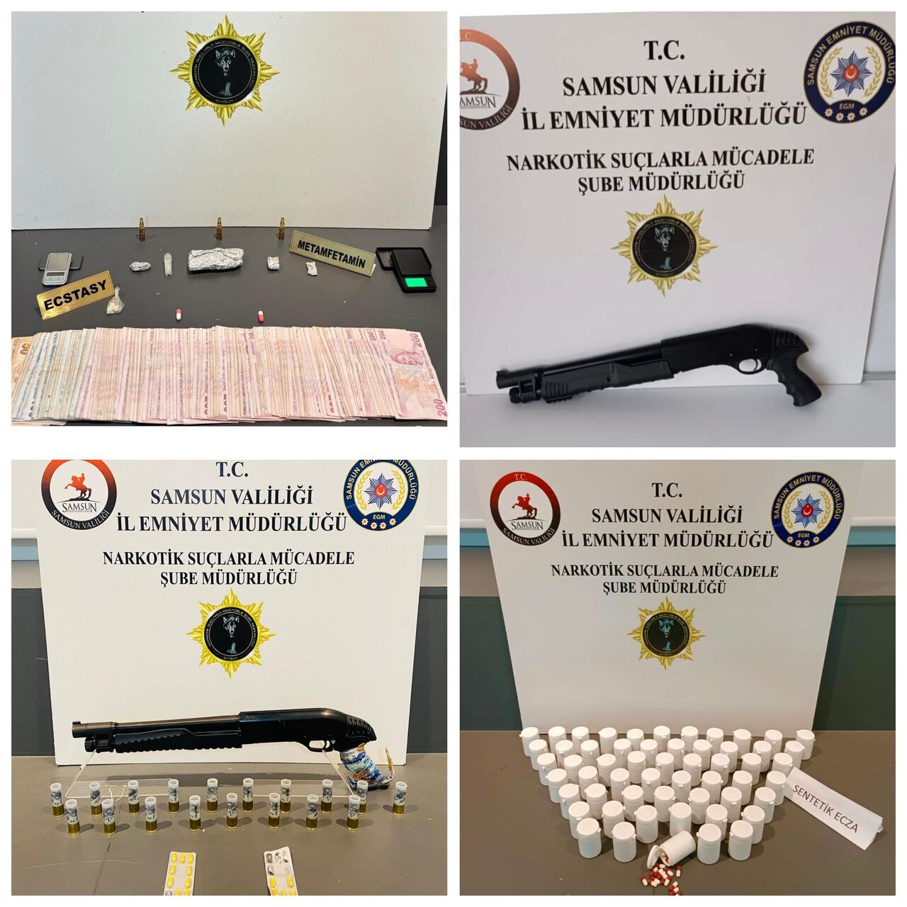 Gerçekleştirilen çalışmalarda bin 93 adet sentetik ecza, 100 mililitre sentetik kannabinoid ham maddesi sıvı aseton, 23 gram metamfetamin, 5 kök kenevir bitkisi, 3 ecstasy hap, 5 uyuşturucu madde kullanım aparatı, 3 hassas terazi, 2 ruhsatsız pompalı tüfek ve uyuşturucu ticaretinden elde edildiği değerlendirilen 42 bin lira ele geçirildi.