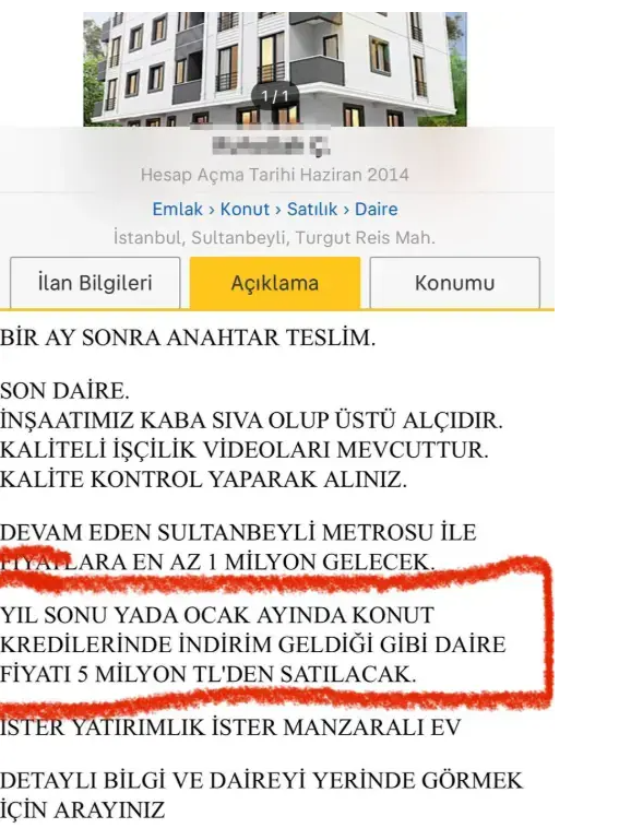 3 milyon 995 bin TL'ye satışa çıkarılan daire için verilen ilandaki notu görenler inanamadı. İlana yazılan "Ocak ayında konut kredilerine indirim geldiği gibi daire 5 milyon TL'den satılacak." ifadeleri fırsatçıların hazır kıta beklediğini ortaya koydu.