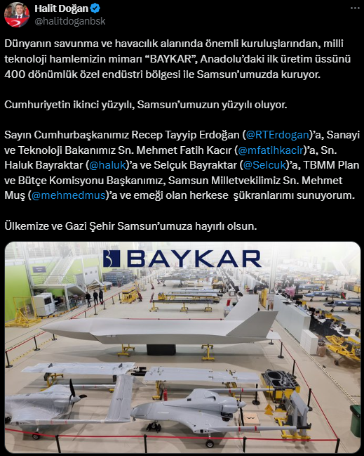 "Dünyanın savunma ve havacılık alanında önemli kuruluşlarından, milli teknoloji hamlemizin mimarı “BAYKAR”, Anadolu’daki ilk üretim üssünü 400 dönümlük özel endüstri bölgesi ile Samsun’umuzda kuruyor."