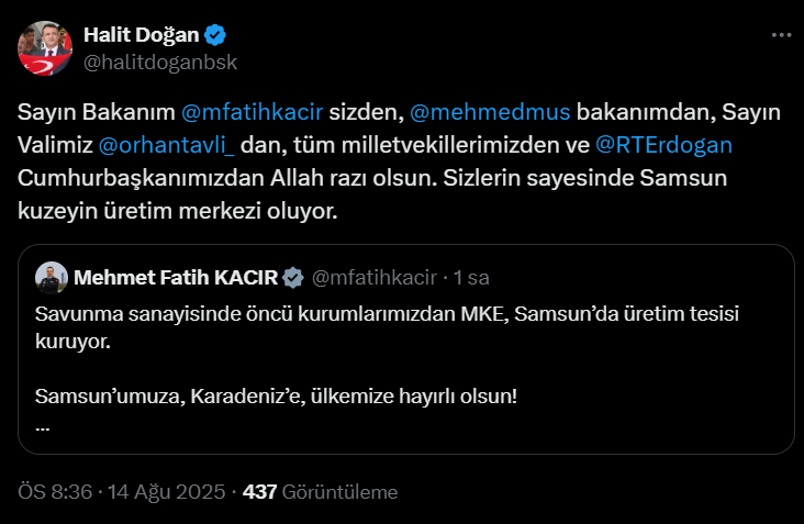 Samsun Büyükşehir Belediye Başkanı Halit Doğan, Sanayi ve Teknoloji Bakanı Mehmet Fatih Kacır’ın paylaşımını alıntılayarak teşekkürlerini iletti. Doğan, “Sayın Bakanım Mehmet Fatih Kacır sizden, Mehmet Muş bakanımdan, Sayın Valimiz Orhan Tavlı’dan, tüm milletvekillerimizden ve Cumhurbaşkanımız Recep Tayyip Erdoğan’dan Allah razı olsun. Sizlerin sayesinde Samsun kuzeyin üretim merkezi oluyor” ifadelerini kullandı.