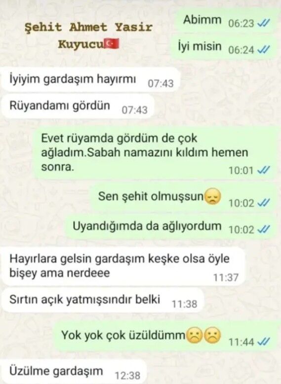 “Evet, rüyamda gördüm. Çok ağladım. Sabah namazından sonra yine ağladım. Sen şehit olmuşsun.”