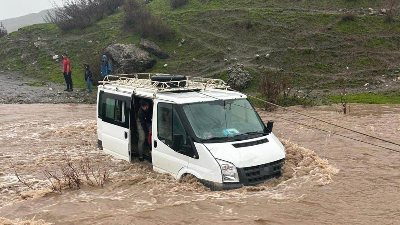 Veysel Karani beldesine bağlı Meşelik köyünden minibüsle yola çıkan vatandaşlar, aşırı yağış nedeniyle taşan derede mahsur kaldı. Araç, kısa sürede yükselen suların ortasında kaldı.