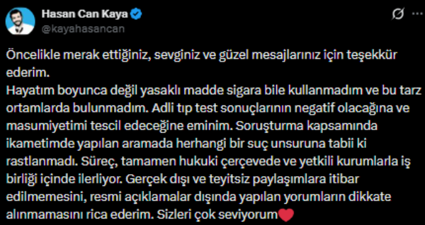 Serbest bırakılmasının ardından sosyal medya hesabından bir açıklama yapan Hasan Can Kaya, hakkındaki iddiaları kesin bir dille reddetti. Kaya, hayatı boyunca sigara dahi kullanmadığını vurgulayarak, Adli Tıp Kurumu’ndan çıkacak test sonuçlarının masumiyetini ortaya koyacağına inandığını ifade etti.