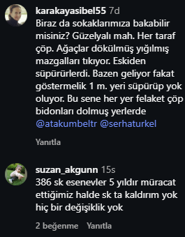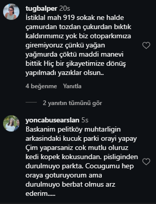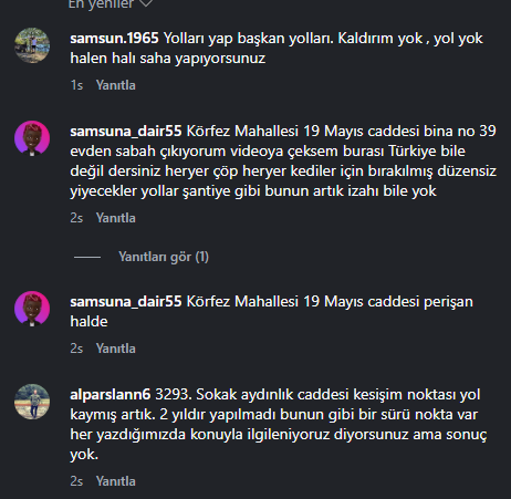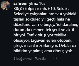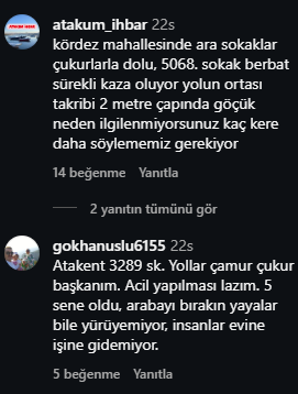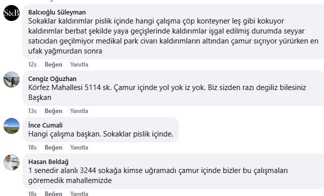 İlçenin farklı noktalarından gelen yorumlarda ise yol ve altyapı sorunları öne çıktı. Vatandaşlar, bazı bölgelerde uzun süredir çalışma yapılmadığını ve sorunların çözülmediğini belirtti.