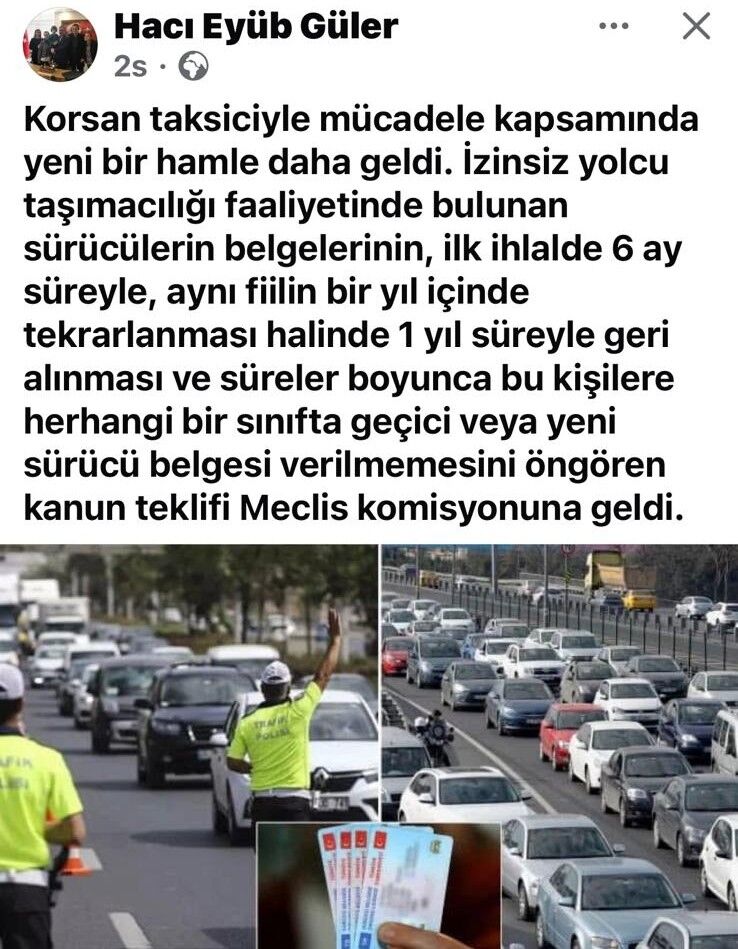 Güler yaptığı açıklamada şu ifadelere yer verdi: "Korsan taksiciyle mücadele kapsamında yeni bir hamle daha geldi. İzinsiz yolcu taşımacılığı faaliyetinde bulunan sürücülerin belgelerinin, ilk ihlalde 6 ay süreyle, aynı fiilin bir yıl içinde tekrarlanması halinde 1 yıl süreyle geri alınması ve süreler boyunca bu kişilere herhangi bir sınıfta geçici veya yeni sürücü belgesi verilmemesini öngören kanun teklifi Meclis komisyonuna geldi."