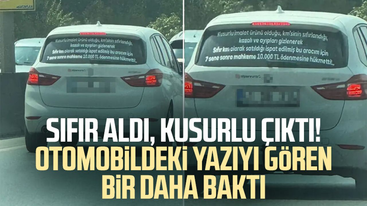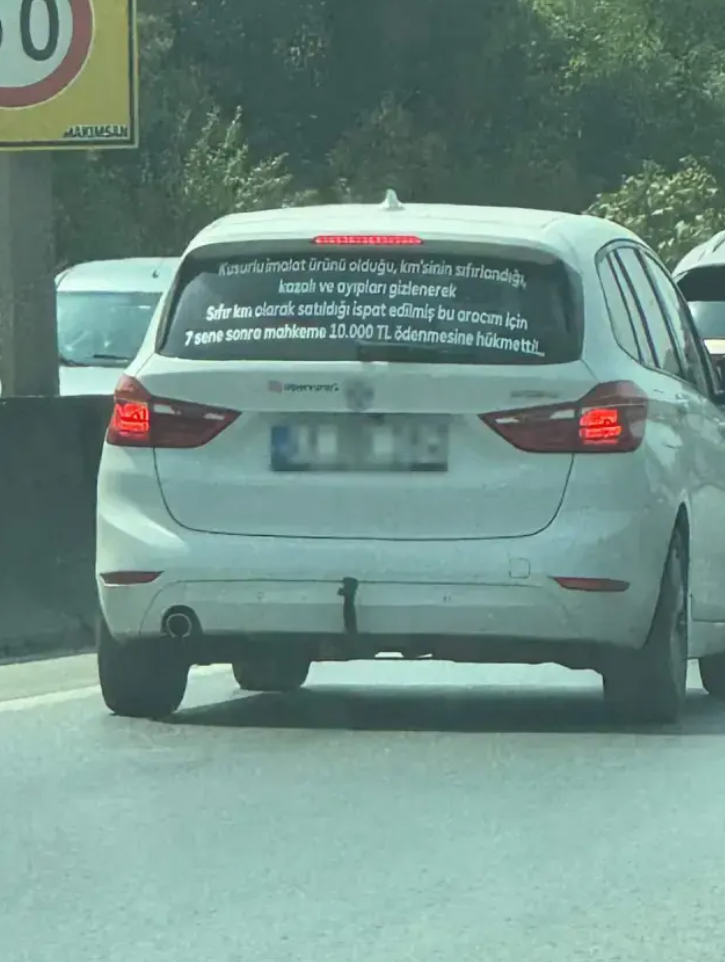 Araç sahibi ise hem otomobil markasından intikam almak için hem de mahkeme kararına tepki göstermek için aracın arkasına yazdığı yazıyla trafikte seyretti. Aracın arka camında yer alan ve sürücünün başından geçenleri özetleyen yazıda şu ifadeler yer aldı: