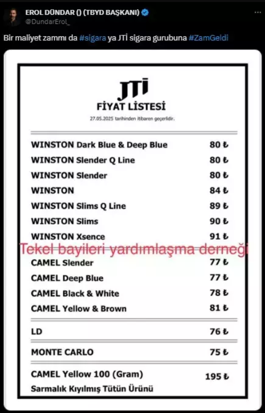 Sigara tiryakilerini üzecek bir gelişme daha yaşandı. Sigara fiyatlarına bir zam daha geldi. Tekel Bayileri Yardımlaşma Derneği Başkanı Erol Dündar, sosyal medya üzerinden yaptığı açıklamayla JTI grubuna ait sigaralara maliyet kaynaklı zam yapıldığını duyurdu.