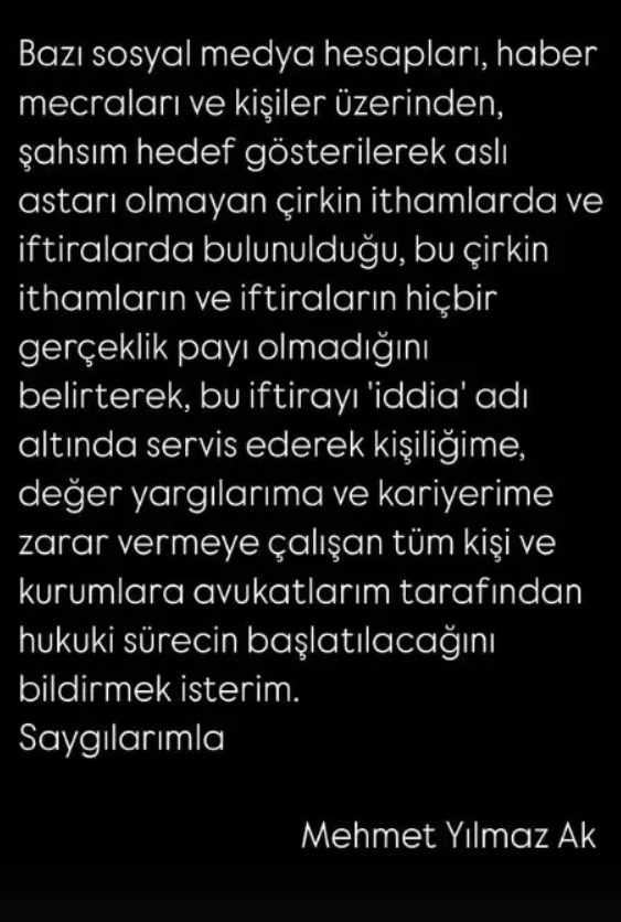 İddiaların ardından gözlerin çevrildiği Mehmet Yılmaz Ak, sessizliğini bozarak yazılı bir açıklama yaptı. Suçlamaları kesin bir dille reddeden Ak, ifadelere şu sözlerle yanıt verdi, "Bazı sosyal medya hesapları, haber mecraları ve kişiler üzerinden, şahsım hedef gösterilerek aslı astarı olmayan çirkin ithamlarda ve iftiralarda bulunulduğu, bu çirkin ithamların ve iftiraların hiçbir gerçeklik payı olmadığını belirterek, bu iftirayı 'iddia' adı altında servis ederek kişiliğime, değer yargılarıma ve kariyerime zarar vermeye çalışan tüm kişi ve kurumlara avukatlarım tarafından hukuki sürecin başlatılacağını bildirmek isterim."