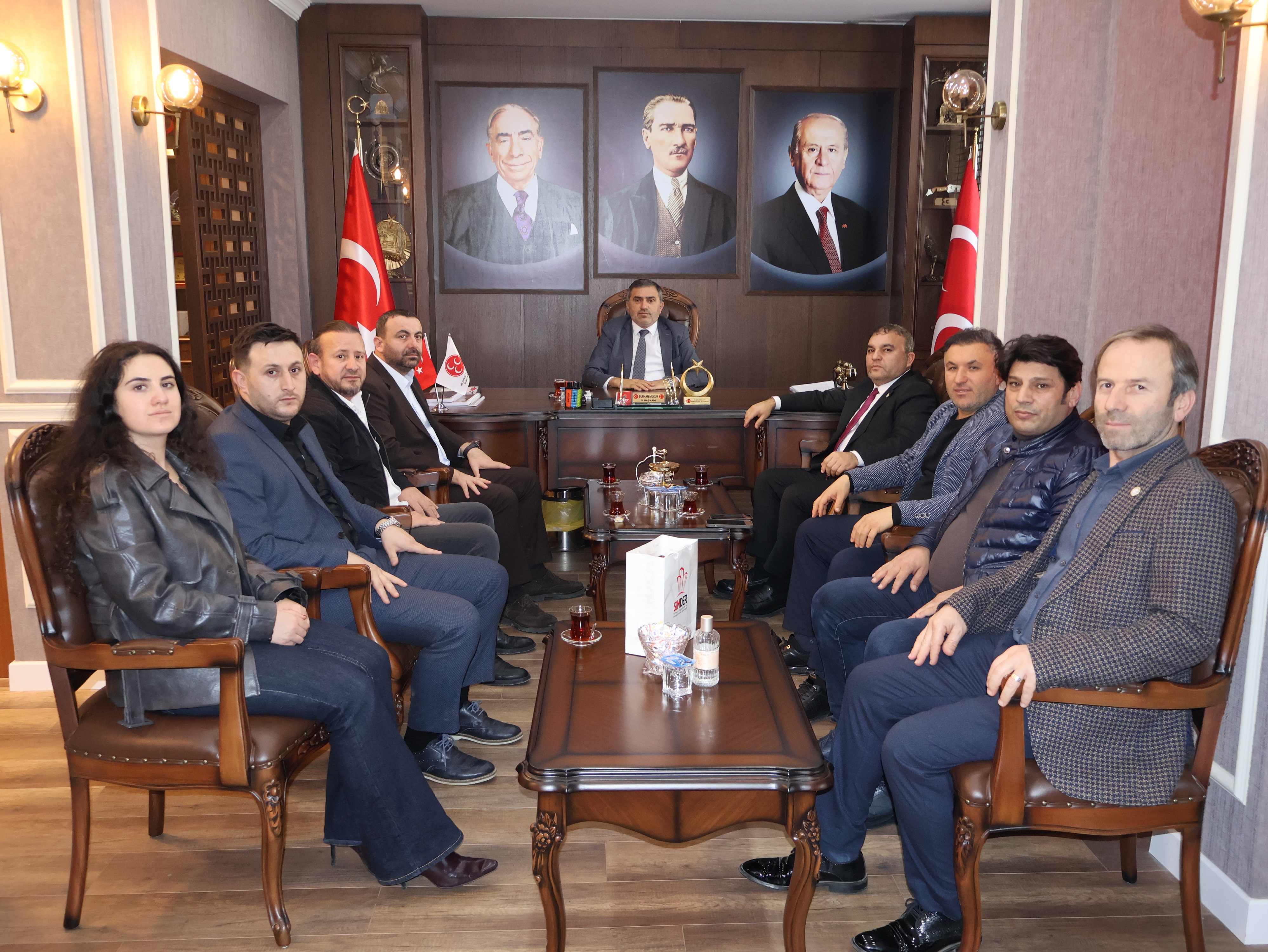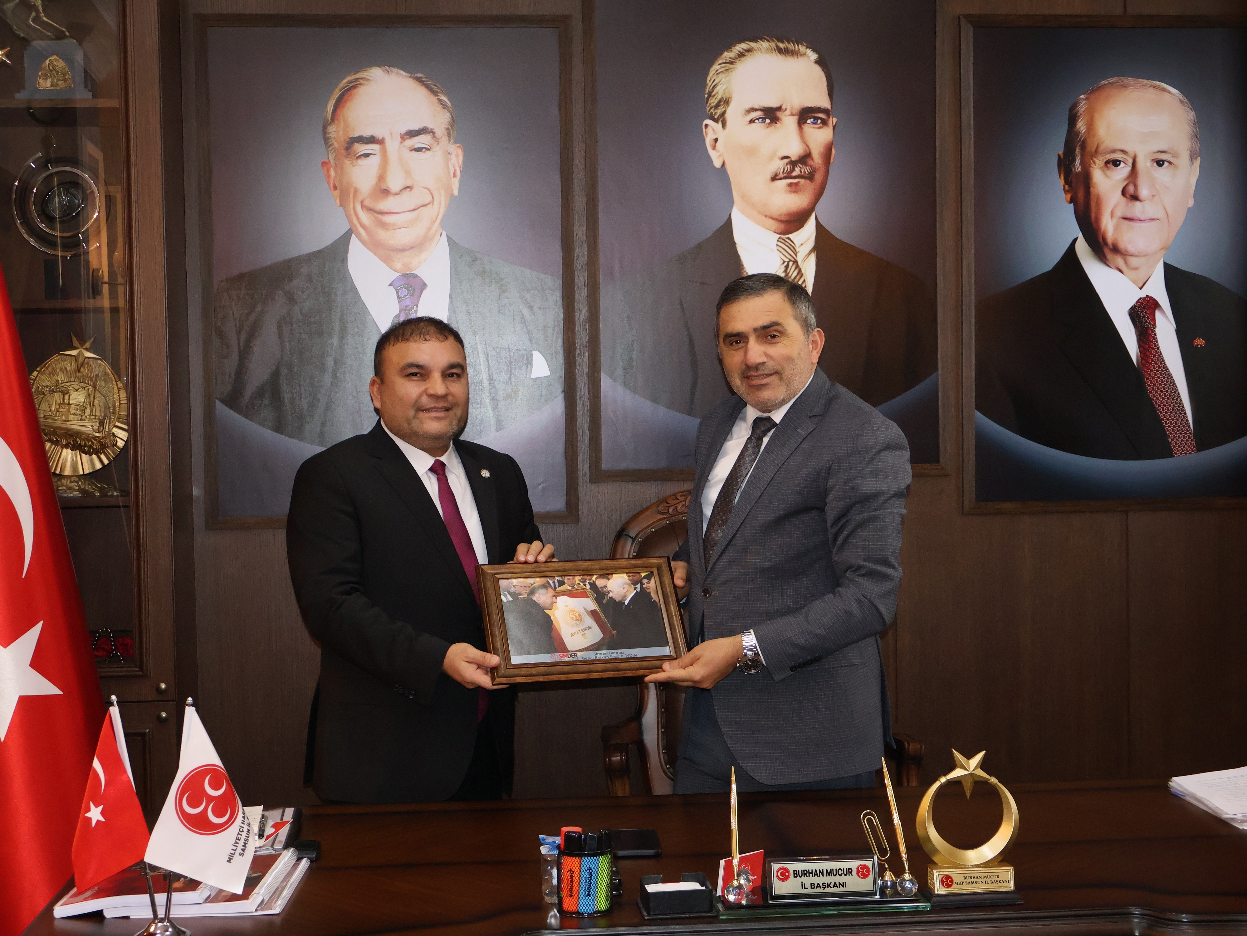 Ziyaret programının son durağı ise Milliyetçi Hareket Partisi Samsun İl Başkanlığı oldu. Başkan Sezgin Aydın ve yönetim kurulu üyeleri, MHP Samsun İl Başkanı Burhan Mucur’u, partinin yeni hizmet binasında ziyaret etti. Yeni binanın Samsun’a ve ülkücü camiaya hayırlı olmasını dileyen Aydın, ziyaret anısına Burhan Mucur’a MHP Genel Başkanı Devlet Bahçeli ile birlikte çekilmiş bir fotoğrafını hediye etti. İl Başkanı Mucur da nazik ziyaretleri dolayısıyla SİMDER yönetimine teşekkür etti.